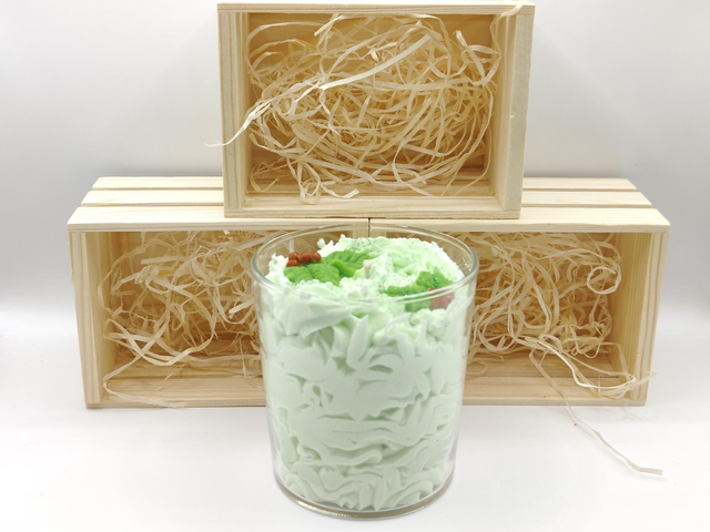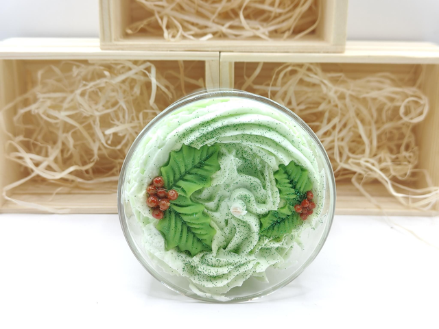 Imaginez une texture aérienne, travaillée à la main comme une chantilly onctueuse, d'un vert pastel tendre qui rappelle la fraîcheur de l'hiver. Pour parfaire ce tableau, nous y avons délicatement déposé quelques feuilles de houx sculptées et leurs baies rouge vif, le tout saupoudré d'un voile de paillettes scintillantes pour capturer la lumière de vos soirées de décembre.